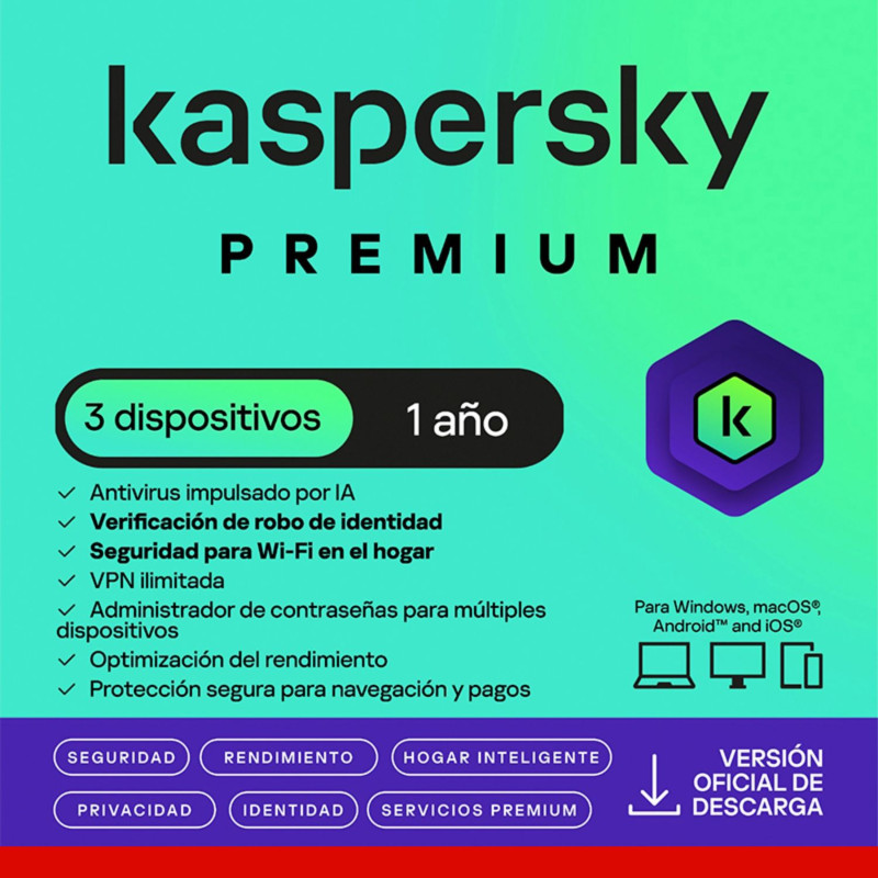 Nuevo ANTIVIRUS KASPERSKY PREMIUM, 3 PCS, LICENCIA 1 AÑO, ESD | NP: KL1047DDCFS S/ 164 Vista rápida Añadir al carrito