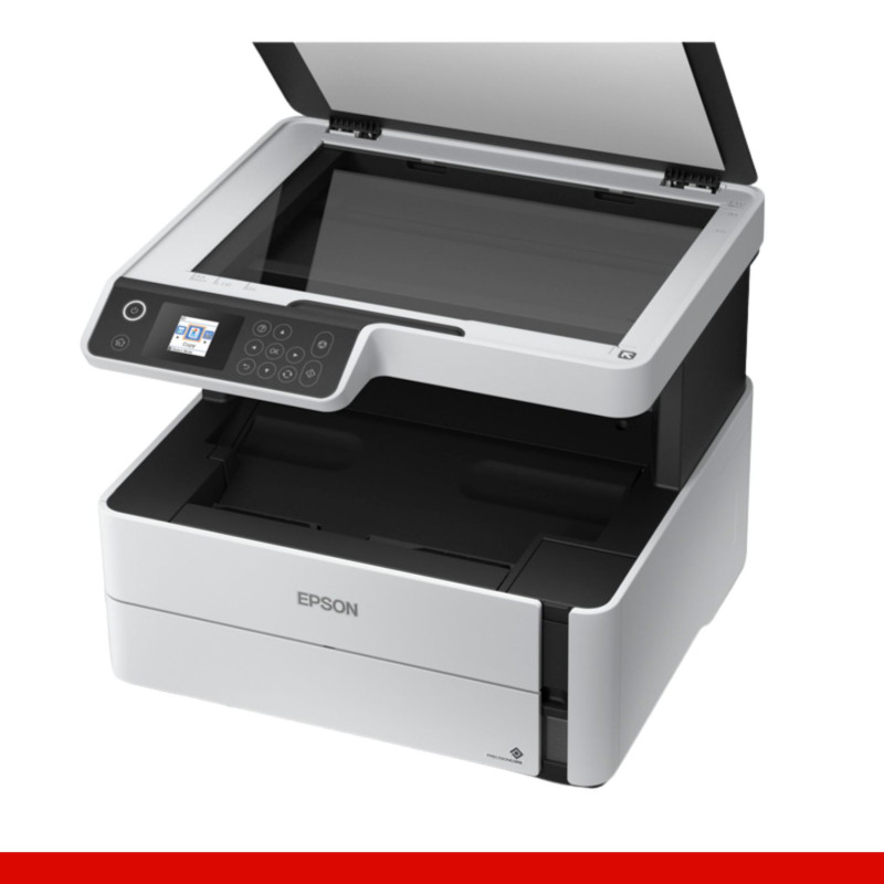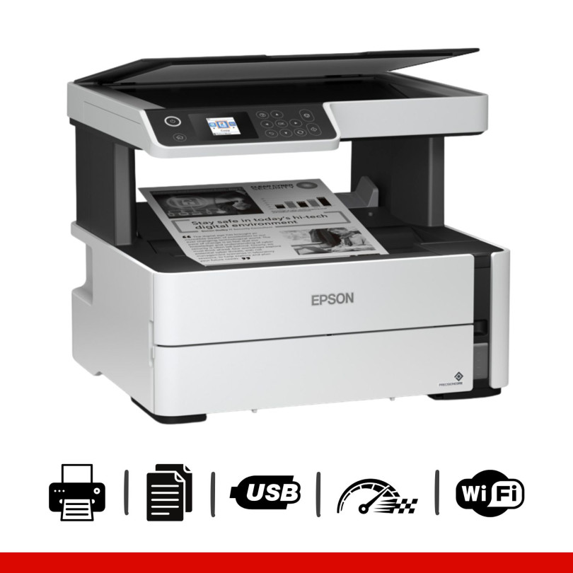 Impresora Epson EcoTank ET-M2170, cable de alimentación y 2 botellas de tinta negra de inicialización.