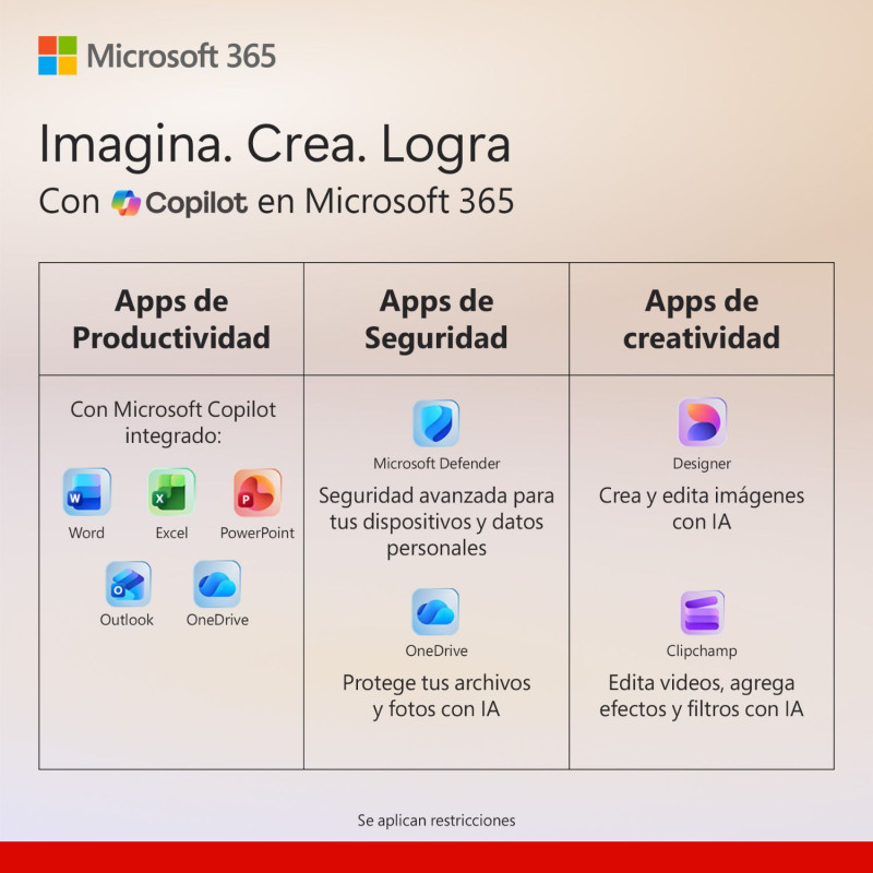 🟥 Funciones de IA: Integradas en aplicaciones de productividad para facilitar tareas y creatividad (disponibles solo para el propietario de la suscripción)